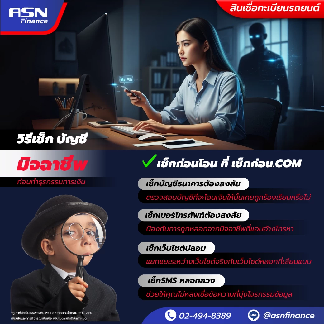 ในโลกออนไลน์ที่เต็มไปด้วยความเสี่ยง การป้องกันตัวเองคือสิ่งสำคัญ อย่าลืมใช้ เช็กก่อน.com เป็นเครื่องมือช่วยตรวจสอบก่อนโอนเงินหรือทำธุรกรรมใด ๆ เพื่อหลีกเลี่ยงการตกเป็นเหยื่อของมิจฉาชีพ และสำหรับใครที่กำลังเผชิญกับปัญหาทางการเงิน การเลือกใช้ สินเชื่อทะเบียนรถยนต์ออนไลน์จาก ASN Finance ถือเป็นอีกหนึ่งทางออกที่ปลอดภัย รวดเร็ว และมั่นใจได้ ว่าคุณจะยังมีรถใช้เหมือนเดิม พร้อมเงินสดที่สามารถนำไปแก้ไขปัญหาได้ทันที