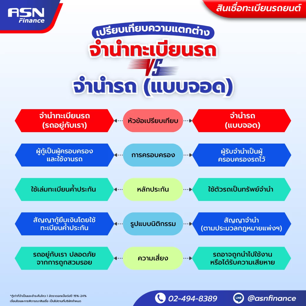 2. เปรียบเทียบความแตกต่าง: จำนำทะเบียนรถ vs จำนำรถ (แบบจอด)